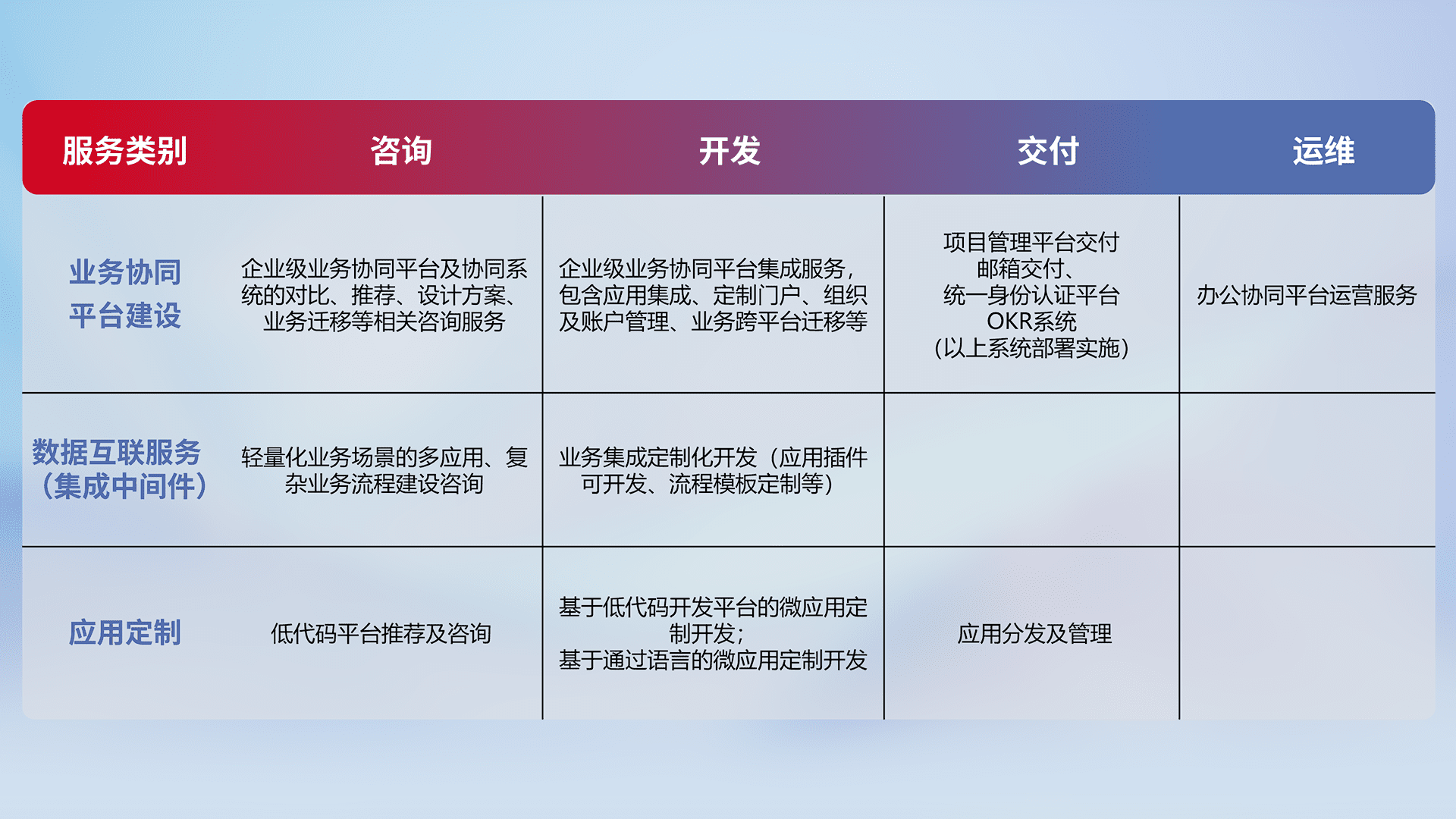 针对钉钉、、企微、、、、IDaas等平台级产品提供产品的规划、、方案、、、交付、、定制化开发等服务,,,,实现如统一协同办公、、智能客户服务、、、混合会议管理、、、、智能数据查询、、、等业务场景,,,实现数字化转型。。。。